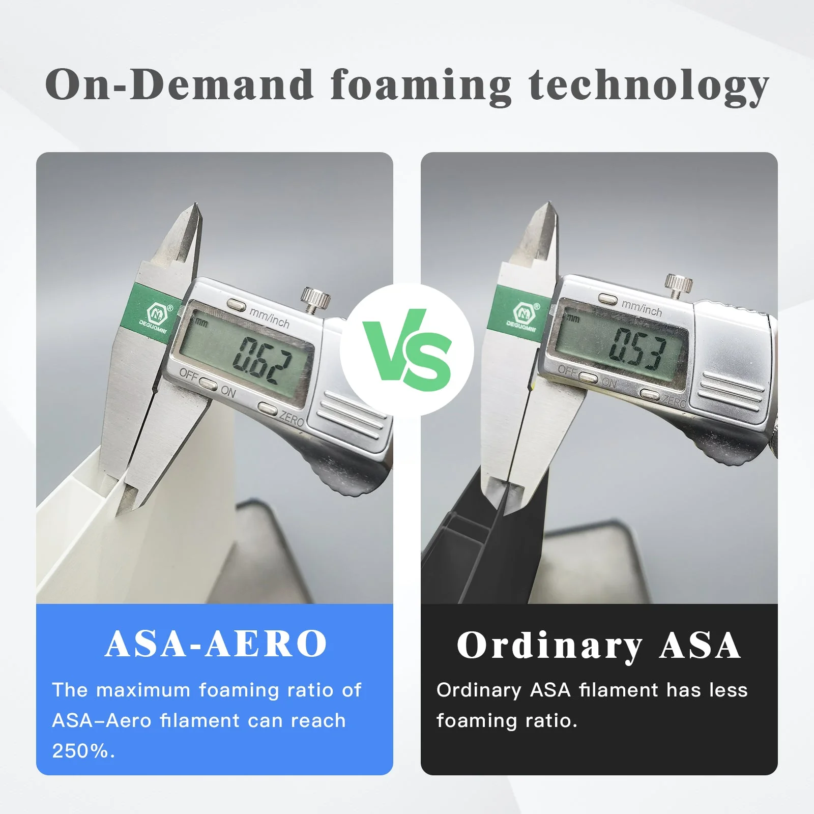 QIDI ASA-Aero is a type of ASA filament that will start foaming with the aid of a blowing agent during the printing process. The blowing agent is in an unexcited state in the ASA filament before printing, During the printing process ,by adjusting the printing temperature, the foaming ratio of the blowing agent can be easily controlled. The maximum foaming ratio can reach 250%. - Meanwhile, QIDI ASA-Aero retains the original UV aging resistance and high heat resistance of ASA material, which is suitable for long-term use in high-temperature outdoor environments.